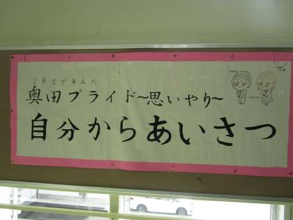 2年生が考えた奥田プライド 公開日 2024/02/08 更新日 2024/02/08 2学年 階段の踊り場の掲示板に2年生が考えた奥田プライドが掲示されていました。自分からあいさつでした。玄関に立っていても自分からおはようございますという生徒が増えています。2年生のおかげかな。さすが、奥田中学校を引っ張っている2年生。