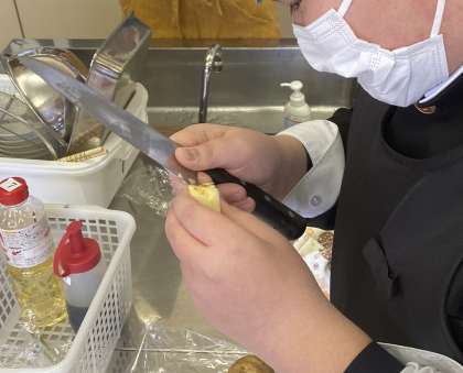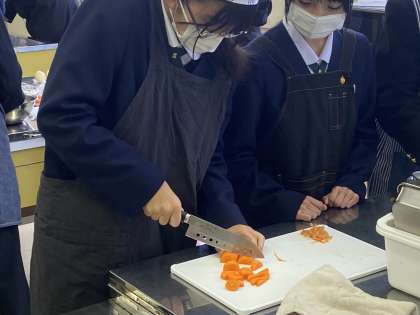 1年3組調理実習 公開日 2024/02/15 更新日 2024/02/15 1学年 2月15日(木) 1年生での調理実習は3回目になりました。 包丁を安全に扱っています。 上 刃先をふきんに包んで持ち運びます。この持ち運び方は定着しています。 中 人参を2つ並べて、まとめて半月切りにしています。 下 じゃがいものくぼみを上手にくり抜いています。