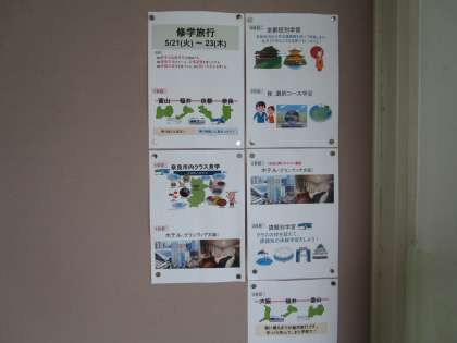 2学年では修学旅行に向けての準備が開始され、事前学習がこれから始まります。学年の廊下の掲示板に5月21日(火)〜23日(木)の2泊3日の行程がけいじされました。