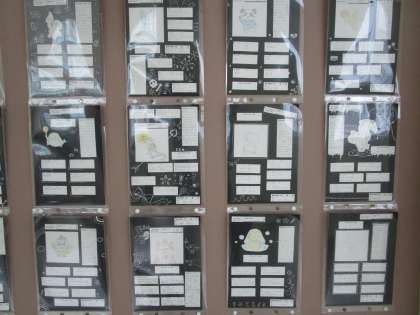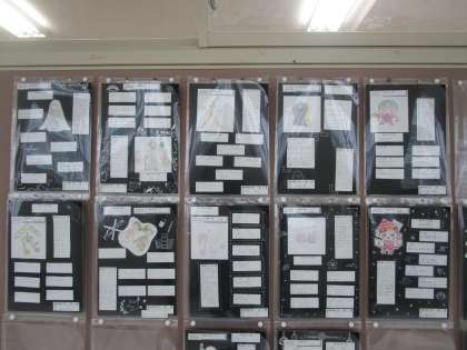 3年生も卒業まであと1週間、教室前の廊下には美術で製作したオリジナルキャラクターが展示されています。中学校生活最後の作品です。