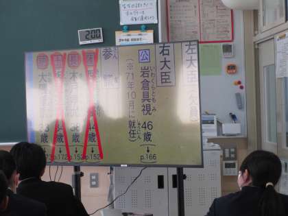 2年4組 社会 公開日 2024/03/07 更新日 2024/03/07 2学年 3月7日(木)3限 2年4組の社会は、征韓論などを学習していました。画面を見ながら、説明を聞きながら学習を深めていました。