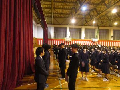 感謝の集い 公開日 2024/03/13 更新日 2024/03/13 学校だより 3月13日(水)3限 卒業式予行の後に、ささやかですが感謝の集いを行いました。1・2年生の代表生徒からのお礼の言葉、3年生代表からのお礼の言葉、教職員へのお礼の手紙のプレゼントがありました。全校生徒、教職員が心一つになったひとときとなりました。ありがとう。