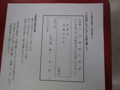 2年3組 国語 公開日 2024/03/15 更新日 2024/03/15 2学年 3月15日(金)1限 2年3組の国語は、「お世話になった方へ手紙を書こう」という課題で学習していました。手紙の書き方の基本などを学習していました。最近は手紙を書くこともきっと少ないですよね。