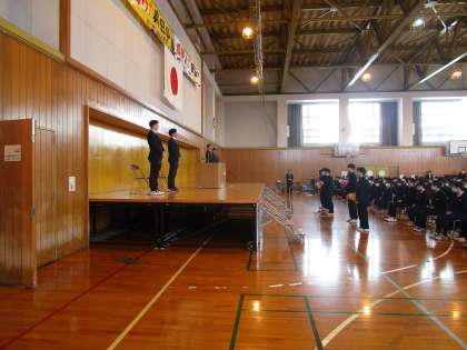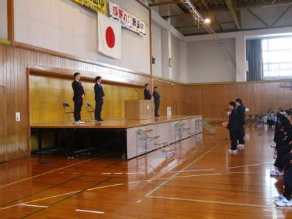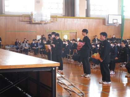 退任・離任式 公開日 2024/03/22 更新日 2024/03/22 学校だより 退任される校長先生はじめ退任・離任される先生方のお話を聞き、生徒代表がお礼の言葉を述べ、花束を贈呈しました。お一人お一人のお話をかみしめて力強く歩みを進めましょう。別れを新たな出発としましょう。