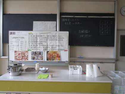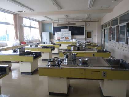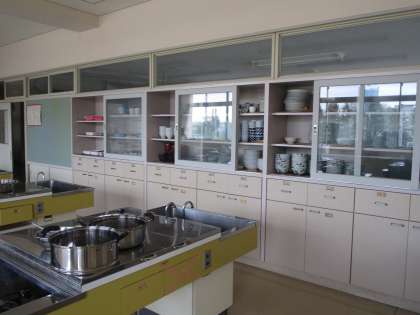調理室です。家庭科で調理実習で使っています。何を作るか楽しみですね。