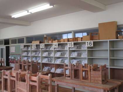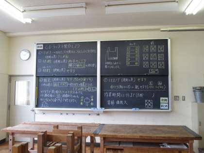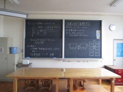 技術室も2つあります。木工室、金工室という感じで使っています。本立てやCDラックなど作製していました。