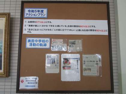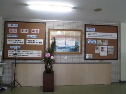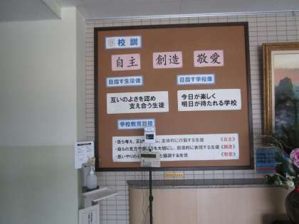 来賓玄関前廊下には校訓、目指す学校像、生徒像、学校教育目標、アクションプラン等が掲示されています。
