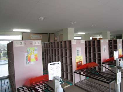 生徒玄関の下足箱です。帰るときは内履きを上の棚に入れています。
