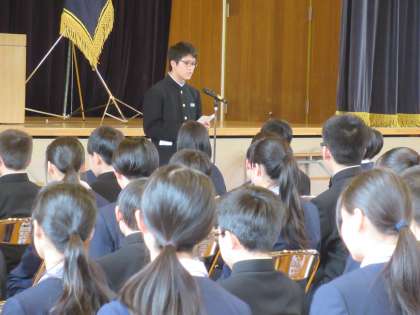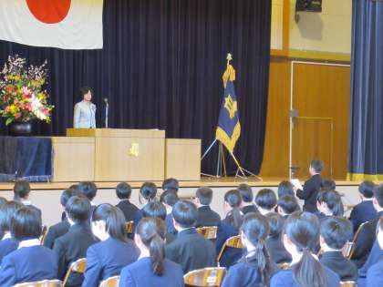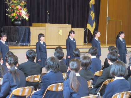 新入生は、慣れない制服に身を包み、緊張した面持ちで参加していました。校長の式辞をしっかりと聞く姿に、中学生らしさが感じられました。語りかけるような生徒代表の挨拶は、心に響きました。音楽部は美しいハーモニーで校歌を披露してくれました。