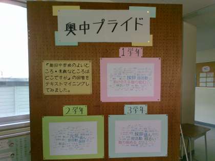 「奥中プライド」について全校生徒に取ったアンケートで出てきた言葉を生徒玄関に掲示しました。奥田中学校の生徒として誇りに思えることや奥田中学校の素敵なところ、奥田中学校の目指したいことなど、たくさんの前向きな言葉が並んでいます。