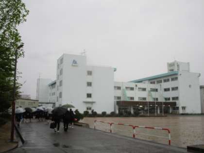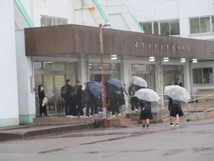 少し肌寒さを感じる朝、雨の中での登校です。傘の中から、元気な朝の挨拶が聞こえます。