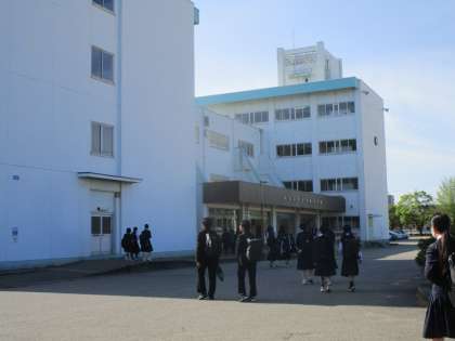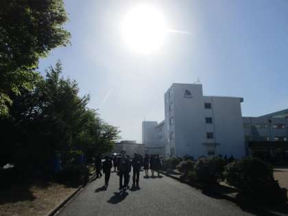 青空の下、登校する生徒の様子です。気持ちよく晴れた朝は、元気がでます。