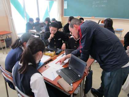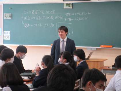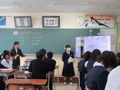 修学旅行2日目の京都での班別学習のルートについて班で話し合いました。担任の先生のアドバイスを受けたり、他の班の紹介を聞いたりして、よりよいルートに向けて考えを深めていました。