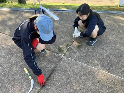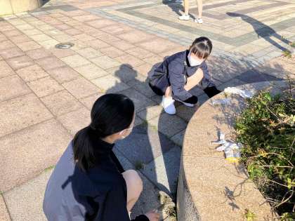 思い思いの場所で草むしりをしたり、石畳のごみを取ったりしていました。