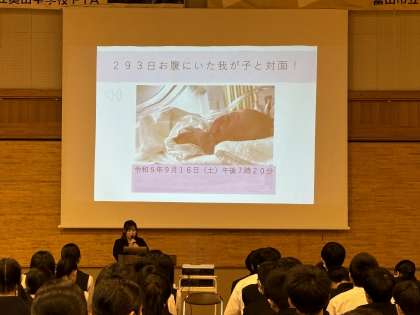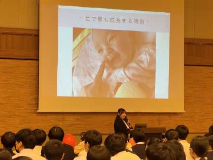 1年時の担任の先生で、生徒たちのことを思いながら時間を掛けて準備してくださり、生徒たちも温かい気持ちで先生と赤ちゃんを見つめていました。途中、赤ちゃんが自分の産声の音声を聞いて泣き出すというハプニングもありましたが、自身もパパである先生が上手にあやしてくれました。