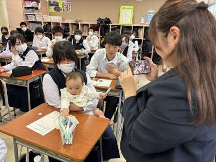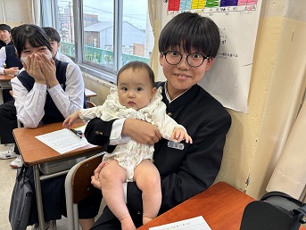 体育館での授業の後、赤ちゃんと一緒に教室を回って、近くで赤ちゃんを見せていただきました。8ヶ月の赤ちゃんは、生徒の持ち物にも興味を示すなど、成長ぶりを見せてくれ、今後の学習にもつながりそうです。