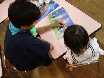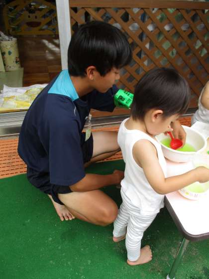 水遊びを見守ったり、ゼリー遊びに何度も優しくつきあったり、絵本を一緒に読んだりする姿が見られました。幼稚園の先生方からも「いい子達ばかりだ」とお褒めの言葉をいただきました。