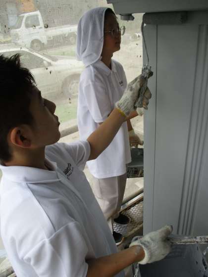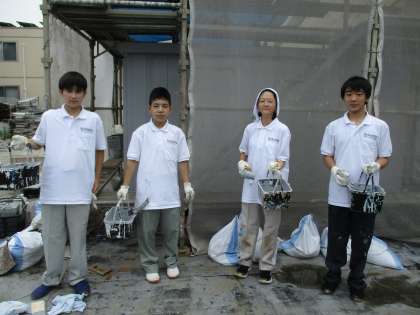 オリジナルポロシャツに作業用ズボンを身につけ、壁にローラーで白く色つけ作業を行っていました。暑い中での外作業に汗をにじませながら頑張っていました。