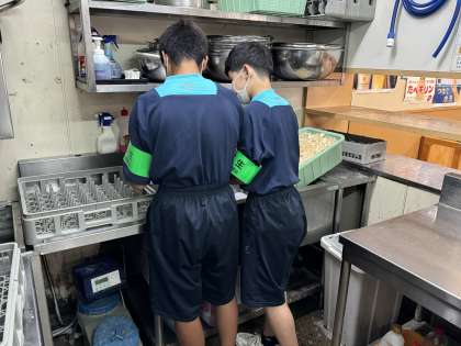 社会に学ぶ「14歳の挑戦」 麺屋丸超 下赤江店 公開日 2024/07/03 更新日 2024/07/03 2学年 忙しいお昼時の店内で、一生懸命洗い物やバッシングを行う姿が見られました。片付け方等分からないことも丁寧に教えてもらい取り組んでいました。