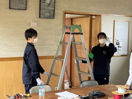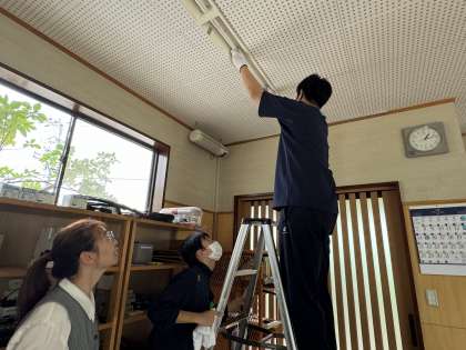 午前中は高所作業車に乗せてもらうなどの活動を行いました。午後からは、直管電球を取り外し、掃除をしていました。部屋の明るさを維持するためには、定期的にほこりを拭き取ることがコツだそうです。