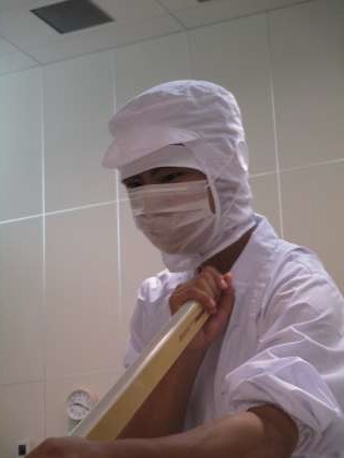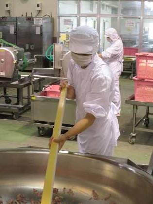 野菜の泥を落とす下処理や大きい鍋窯に入った肉を大きな木しゃもじを使って炒めていました。白衣を着用し感染対策をしながら、普段入ることのできない場所で給食が提供されるまでの過程を学んでいました。