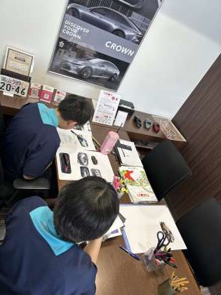 午前中はツナギを着て車の整備を体験し、午後からはポップ作りに励んでいます。