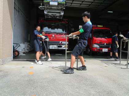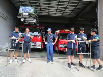 7月3日(水) 社会に学ぶ「14歳の挑戦」 3日目 富山消防署中分署 公開日 2024/07/03 更新日 2024/07/03 2学年 通信指令課で実際に119番に電話をかけたり、ロープを使っての結索訓練をしたりしました。暑い中、がんばっていました。