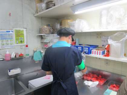 社会に学ぶ「14歳の挑戦」3日目 大阪屋ショップ粟島店 公開日 2024/07/04 更新日 2024/07/04 2学年 青果部門と総菜部門に分かれて作業をしていました。 青果部門ではスイカ、総菜部門ではコロッケをパックにつめていました。 2人とも、黙々と集中して頑張っていました。