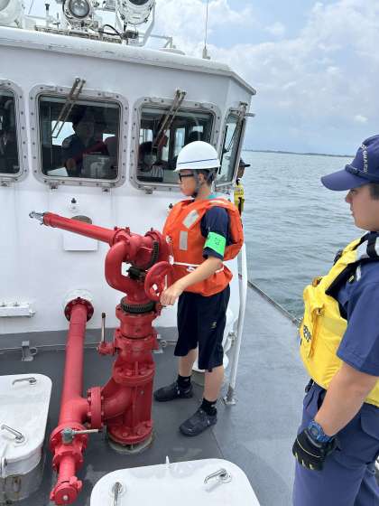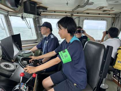 海上でホースの放水を体験したり、船の操舵について習ったりしました。