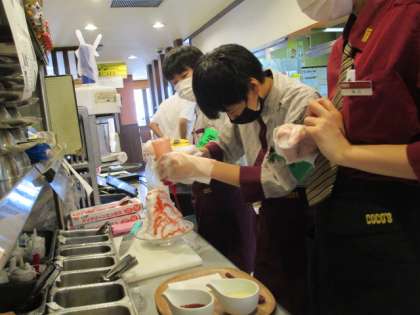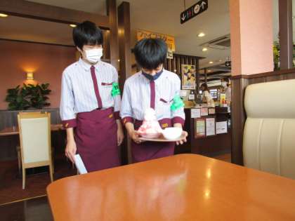 7月4日(木)社会に学ぶ「14歳の挑戦」 4日目 ココス千代田店 公開日 2024/07/04 更新日 2024/07/04 2学年 洗い物や商品の補充、接客をしていました。また、生徒2人がかき氷を作って提供してくれました。心のこもったかき氷はとても美味しかったです。