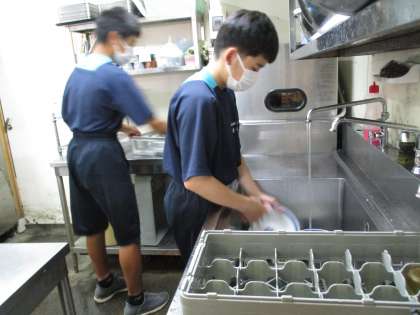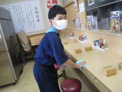 7月5日(金)社会に学ぶ「14歳の挑戦」 5日目 麺屋丸超 下赤江店 公開日 2024/07/05 更新日 2024/07/05 2学年 ホールでは、お客様の食器を片付けたり、テーブルを拭いたりしていました。厨房の奥では食器を水洗いし、機械を用いて洗浄していました。