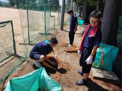 7月5日(金) 社会に学ぶ「14歳の挑戦」 5日目 奥田中学校での活動 公開日 2024/07/05 更新日 2024/07/05 2学年 事業所がお休みで活動がない生徒が奥田中学校で用務員さんの仕事を体験しました。暑い中、グラウンドの枯れ葉を集め運んでいました。
