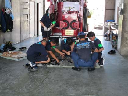 はしご付消防自動車に乗りました。所員の方と一緒に、声を出して一緒に確認作業もしました。