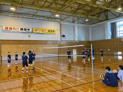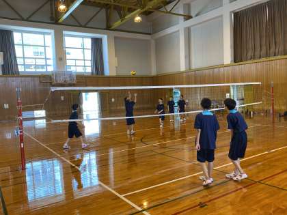 これまではバドミントンコートで試合をしましたが、今日からはバレーボールコートに2mのネットを張って試合をしました。コートにボールを落とさないよう、チームみんなで必死にボールを追いかけています。自然と「ナイス!」の声や拍手、ハイタッチをしている場面が多く見られ、とても温かい雰囲気で授業に取り組んでいます。