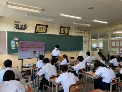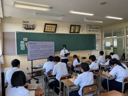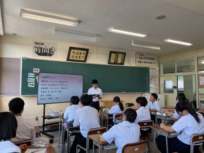 7月22日(月) 2限 1学年 総合『先輩に学ぼう』 公開日 2024/07/22 更新日 2024/07/22 1学年 『14歳の挑戦』で先輩たちが学んできたことや仕事の内容を聞き、自分たちの来年の活動に期待を膨らませています。