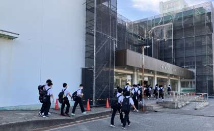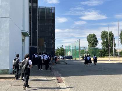 7月22日(月) 登校の様子 公開日 2024/07/22 更新日 2024/07/22 学校だより 今日から大暑、暑い朝です。1学期、最後の週のスタートです。 1・2限に、2年生が「社会に学ぶ『14歳の挑戦』」の発表会を行います。 今日は、学期末懇談会の最終日です。自家用車の利用については、学校周辺及び敷地内での安全に十分ご注意ください。できる限り、体育館側出入口、体育館横駐車場の利用にご協力をお願いします。暑さが厳しくなる予報です。気を付けてお越し下さい。