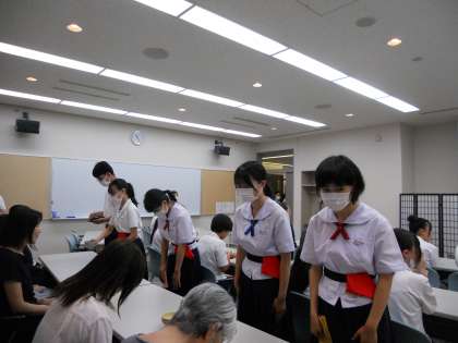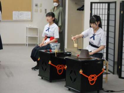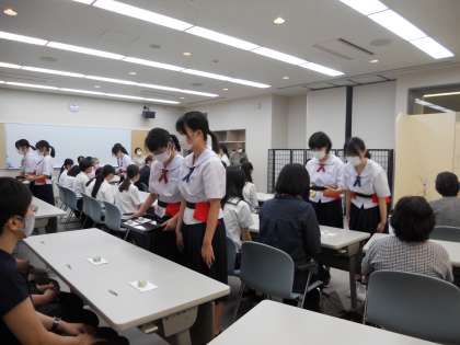 茶道部 学校茶道研修茶会その1 公開日 2024/07/25 更新日 2024/07/25 部活動 7月21日(日)、サンフォルテで行われた学校茶道研修茶会に参加し、お点前・半島、お運びを担当しました。