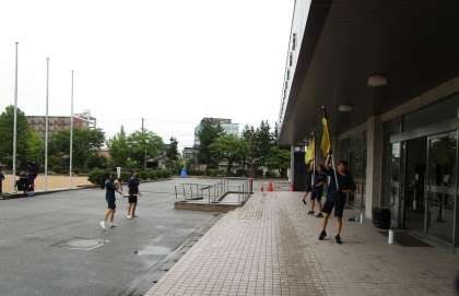生徒玄関の屋根の下では、吹奏楽部が活動しています。