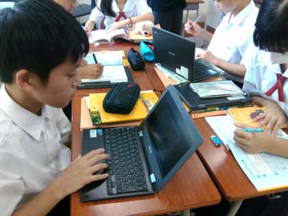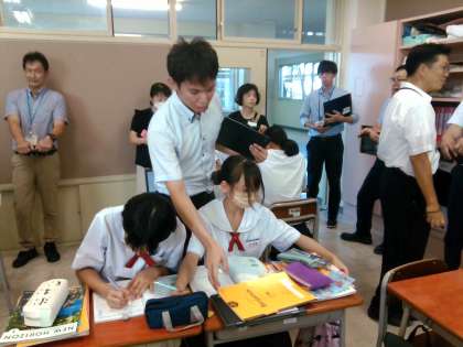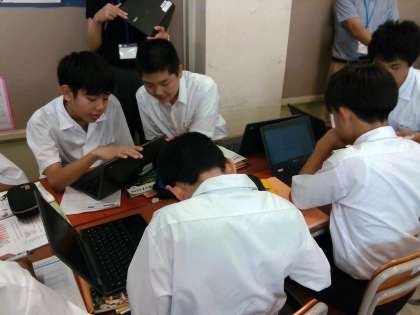 グループになって協力したり、一人で英語のリスニングを聴いて確かめたり、先生に質問たりして個に応じた学びを展開しています。