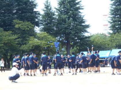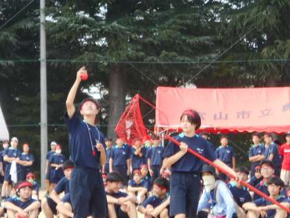 今年からの新競技「玉入れ」です。 各団コントロールよくかごへ向けて投げています。