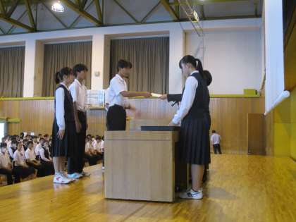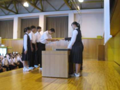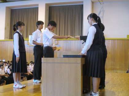 10月1日(火) 後期生徒会役員認証・任命式(1) 公開日 2024/10/01 更新日 2024/10/01 2学年 6限は、前期生徒会のまとめ集会の後、後期生徒会役員の認証式と任命式を行いました。 後期生徒会長及び副会長が、校長先生から認証状を授与されました。