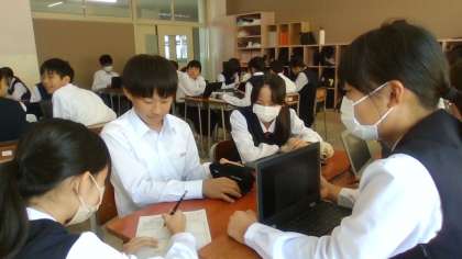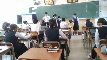10月9日(水) 3限 1学年 学級討議 その3 公開日 2024/10/09 更新日 2024/10/09 1学年 11:00 写真 上:1年1組 広報委員による活動計画説明 下:1年5組 生活班による質問、修正案作成のための相談