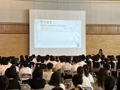 10月23日 進路説明会 公開日 2024/10/24 更新日 2024/10/24 3学年 5、6限に、体育館で進路説明会がありました。 まず、教務主任が全国学力学習、状況調査についての説明をしました。 その進路指導主事、学年主任から進路に関する様々な説明がありました。
