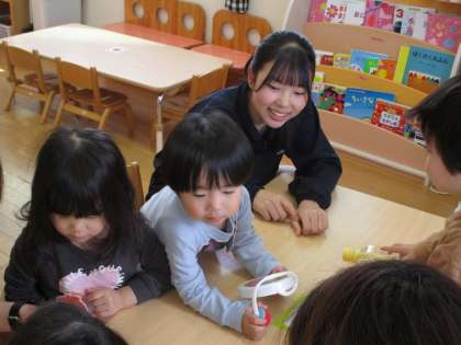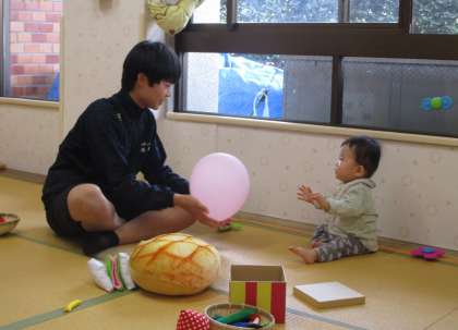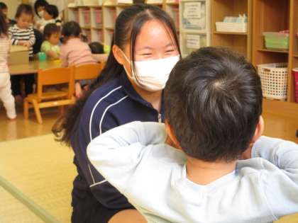 今日は3年1組が奥田保育園で活動しました。 園児を見つめる中学生のまなざしが優しいです。