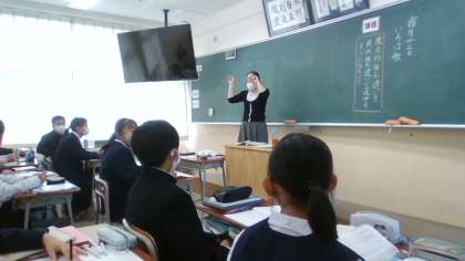 写真 上:1年4組 数学 少人数教室 下:1年3組 国語 いろは歌の復習
