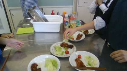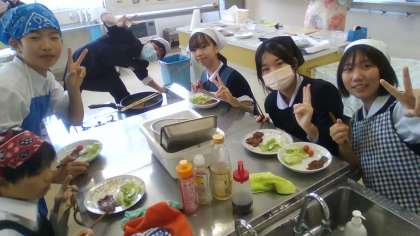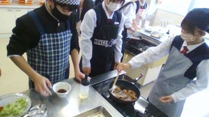11月21日(木) 3限 1学年の授業 その3 公開日 2024/11/23 更新日 2024/11/23 1学年 1年3組 技術・家庭科家庭分野 調理実習(豚肉の生姜焼き) 上:うまく焼けるかな? 中:完成! 下:いただきます!!