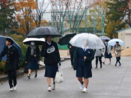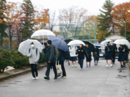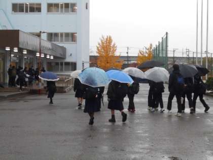 11月29日(金) 登校風景 公開日 2024/11/29 更新日 2024/11/29 学校だより 今日も冷たい雨の朝です。強い雨も降るようになってきました。 冬が近づくにつれて雨や雪の日が多くなります。時間に余裕を持って登校してください。 11月も最後の登校日となりました。今年もあと1ヶ月です。