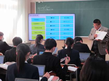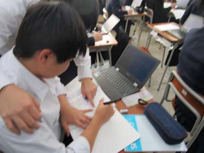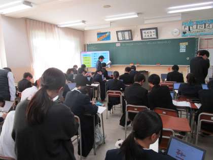 12月2日(月) 3年生授業の様子 公開日 2024/12/03 更新日 2024/12/03 3学年 3年5組の数学では「円と交わる直線でできる図形について相似である三角形を証明しよう」という課題に取り組みました。GIGAスクール研修の一環として多くの先生が参観する中、ヒントを活用したり友達と話し合ったりしながら学習を進めました。