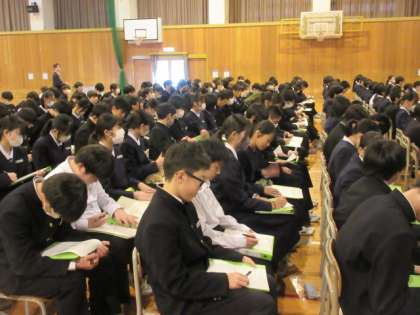 12月2日(月) 2学年 学年集会 公開日 2024/12/03 更新日 2024/12/03 2学年 本日、5限目に「受検の流れと入試制度」について、学年主任から説明をしました。 県立高校と私立高校の違いや受検の方法などについての話を真剣に聞き、メモを取る姿が見られました。