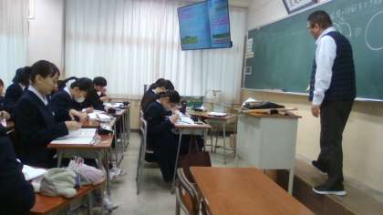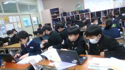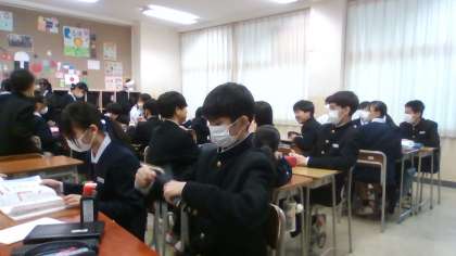 12月5日(木) 1限 1学年の授業 その1 公開日 2024/12/05 更新日 2024/12/05 1学年 1年生の1限目の授業の様子です。 写真 上:1年2組 社会 アメリカ調べ 中:1年3組 国語 来年の書初めの準備を始めました! 下:1年4組 数学 少人数学習